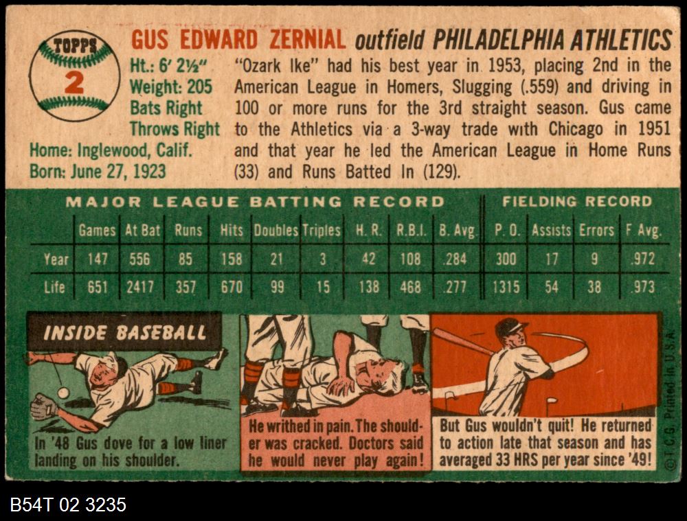 | 1954 Topps #2 WHT Gus Zernial | 4 - VG/EX | Front | Back |