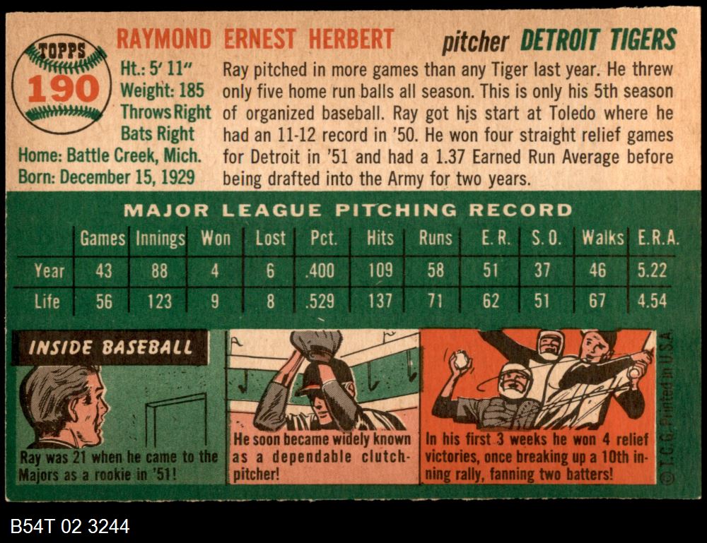 | 1954 Topps #190 Ray Herbert | 5 - EX | Front | Back |