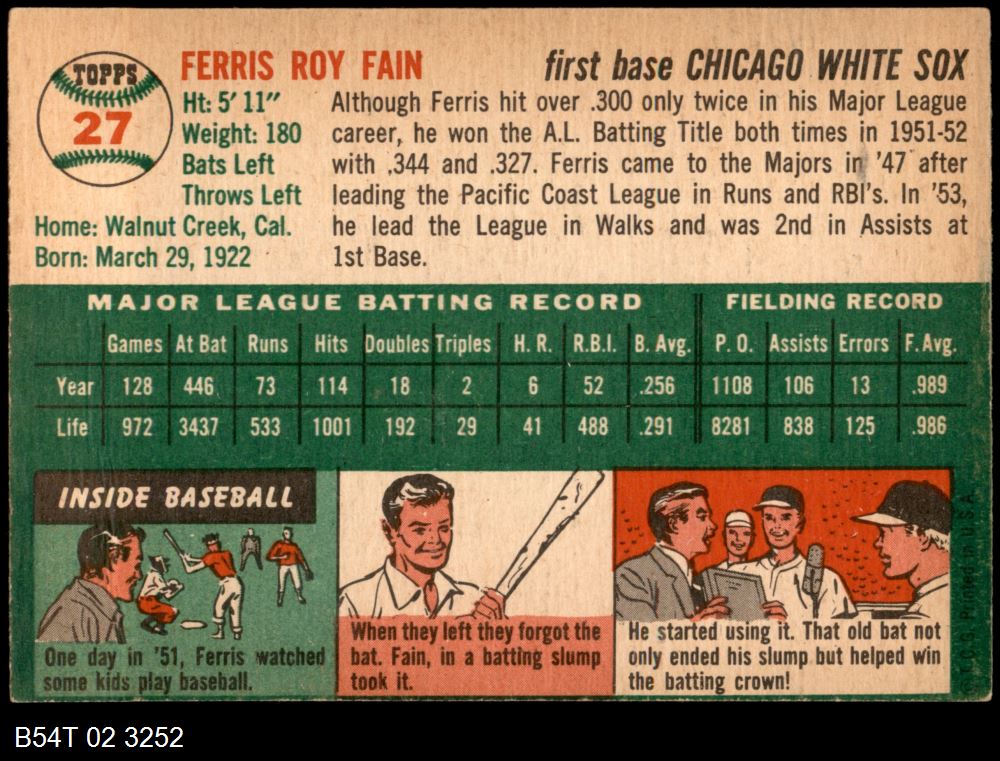 | 1954 Topps #27 WHT Ferris Fain | 5 - EX | Front | Back |