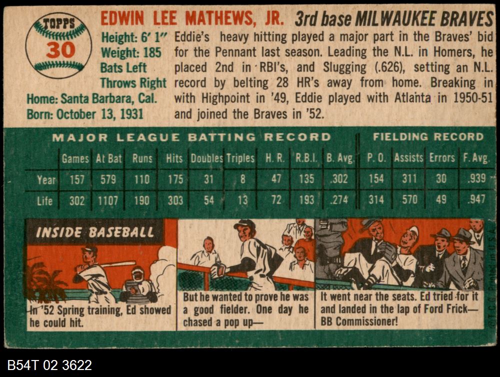 | 1954 Topps #30 WHT Eddie Mathews | 4 - VG/EX | Front | Back |
