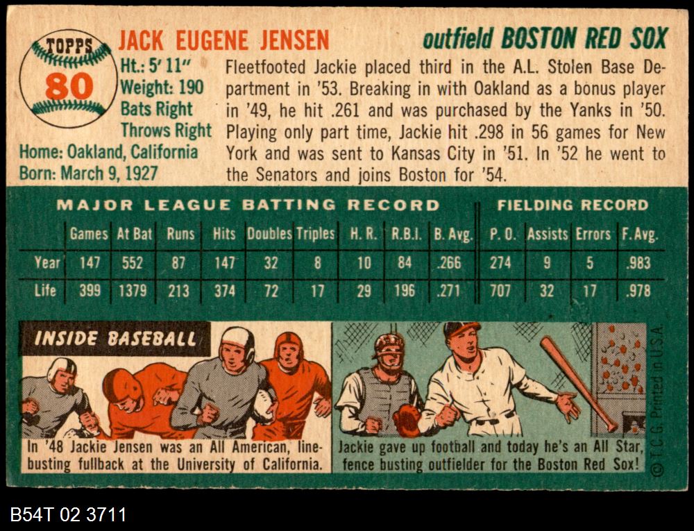 | 1954 Topps #80 Jackie Jensen | 5 - EX | Front | Back |