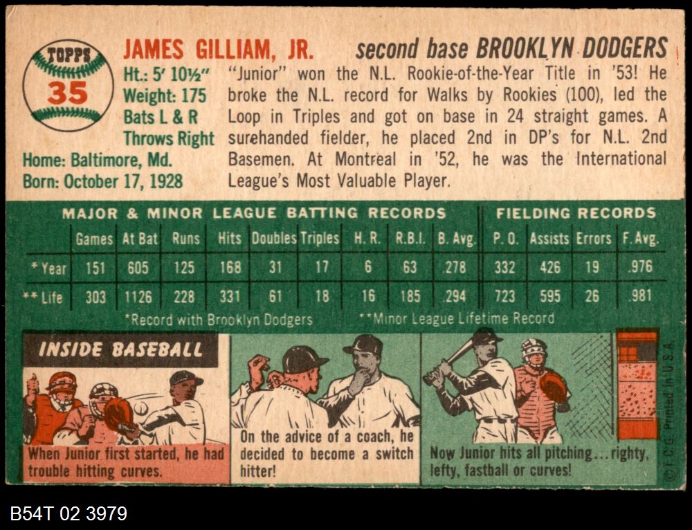 | 1954 Topps #35 WHT Jim Gilliam | 5 - EX | Front | Back |