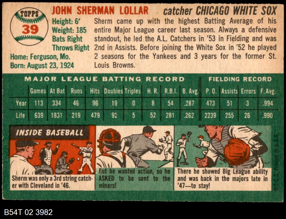 | 1954 Topps #39 WHT Sherm Lollar | 5 - EX | Front | Back |