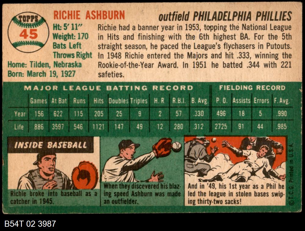 | 1954 Topps #45 WHT Richie Ashburn | 4 - VG/EX | Front | Back |