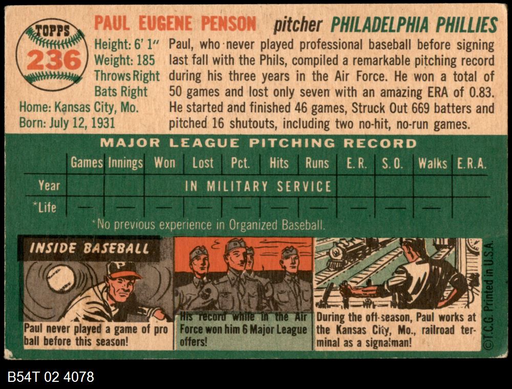 | 1954 Topps #236 Paul Penson | 4 - VG/EX | Front | Back |