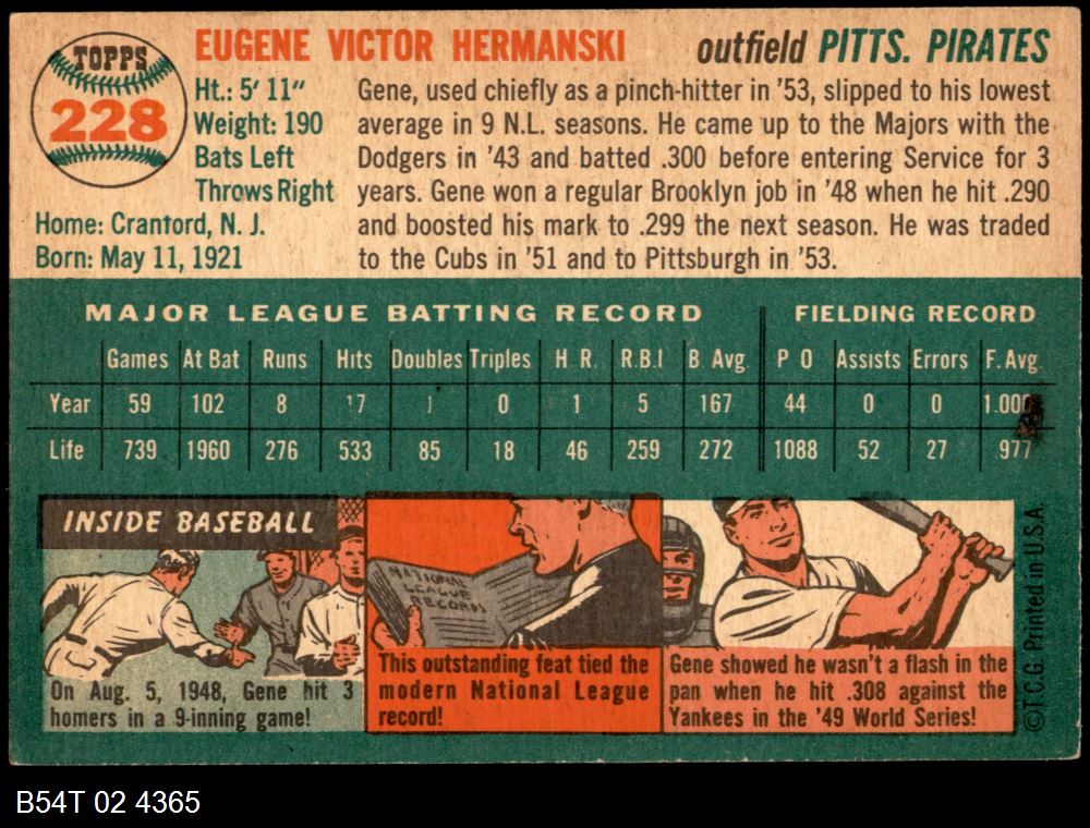 | 1954 Topps #228 Gene Hermanski | 5 - EX | Front | Back |