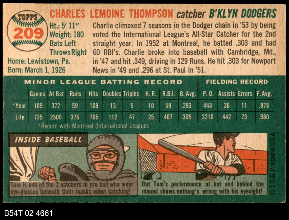| 1954 Topps #209 Charlie Thompson | 5 - EX | Front | Back |