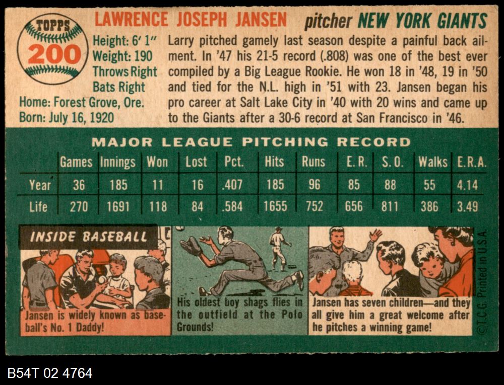 | 1954 Topps #200 Larry Jansen | 5 - EX | Front | Back |