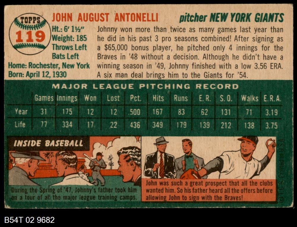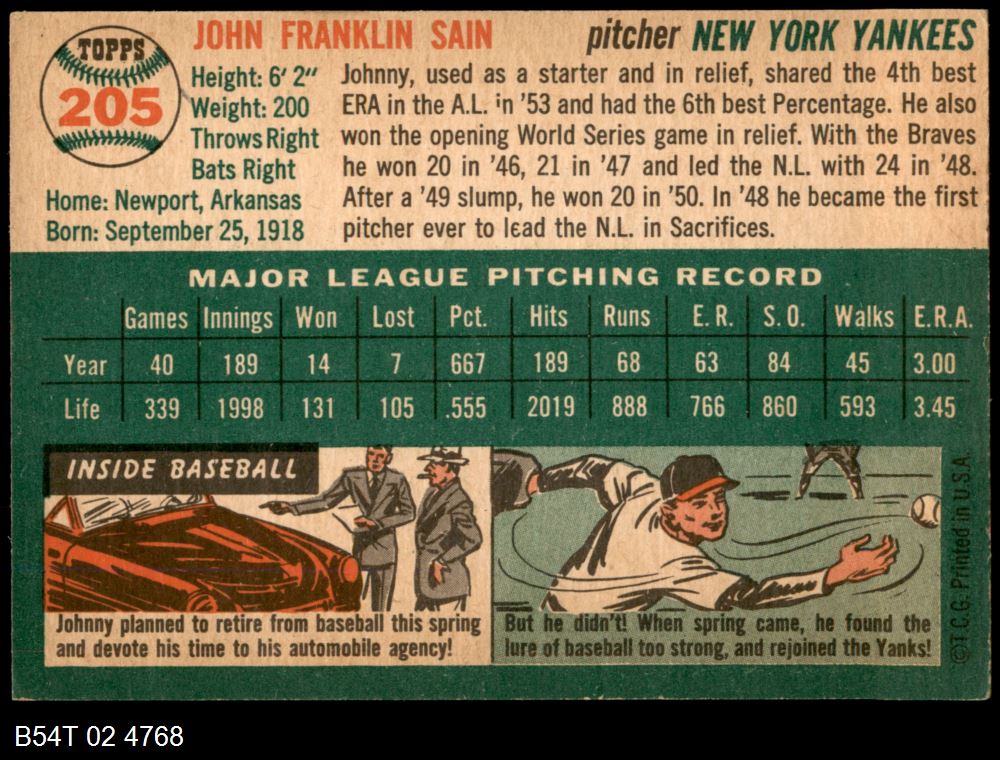 | 1954 Topps #205 Johnny Sain | 5 - EX | Front | Back |