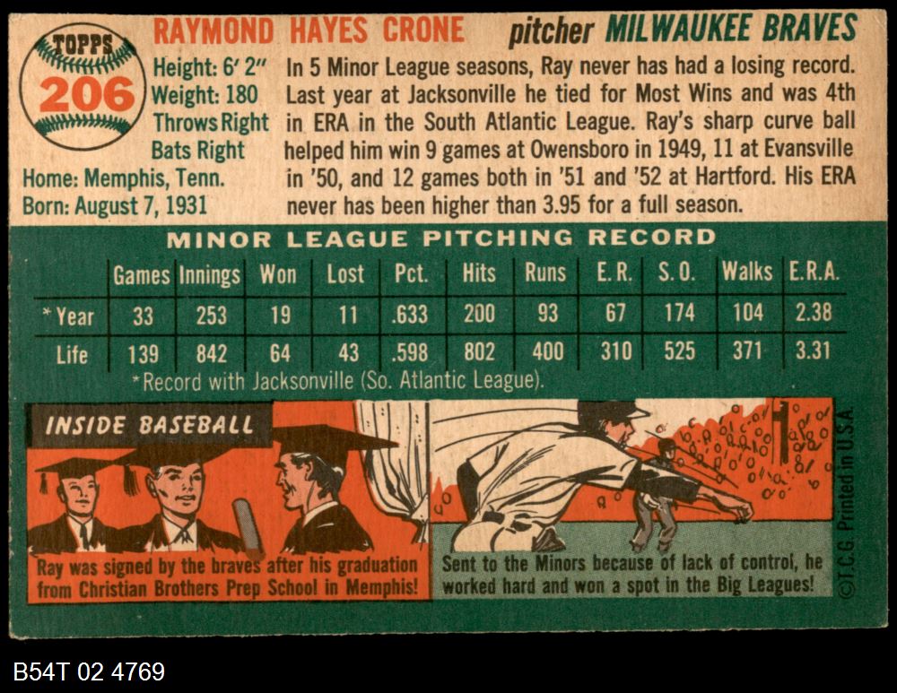 | 1954 Topps #206 Ray Crone | 5 - EX | Front | Back |