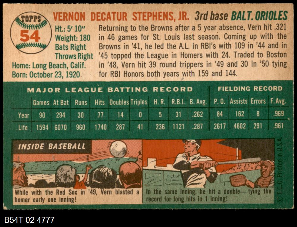 | 1954 Topps #54 Vern Stephens | 4.5 - VG/EX+ | Front | Back |