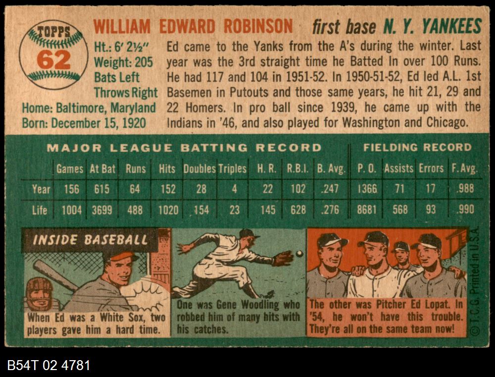 | 1954 Topps #62 Eddie Robinson | 5 - EX | Front | Back |