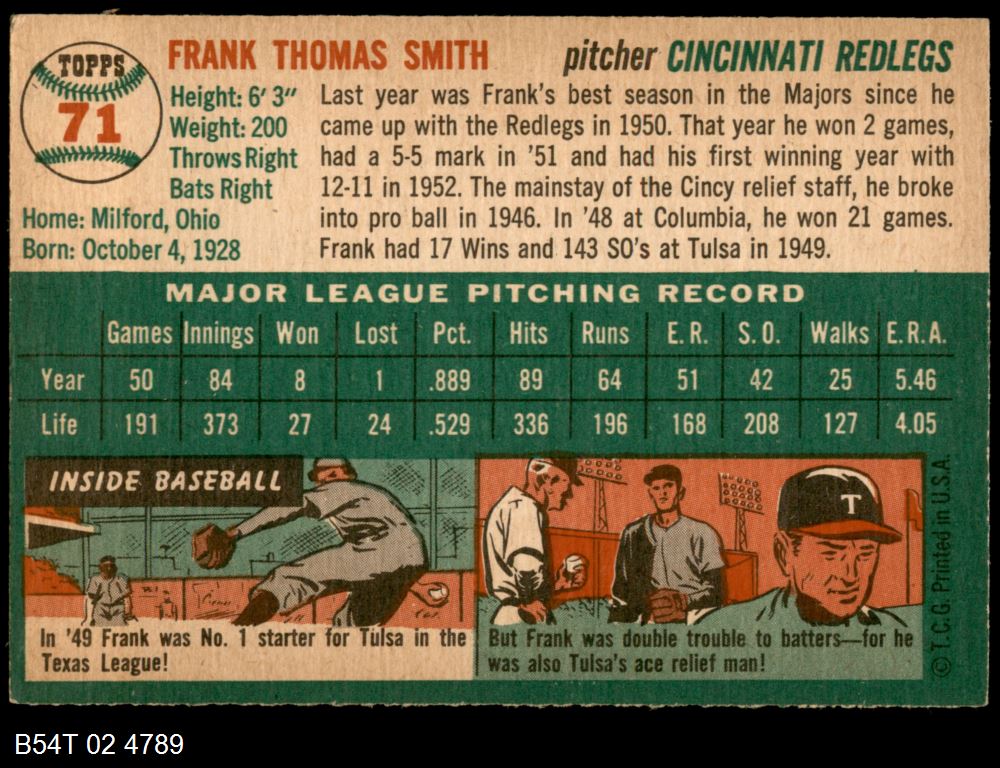 | 1954 Topps #71 Frank Smith | 5 - EX | Front | Back |