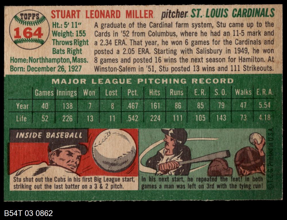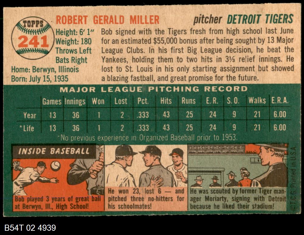 | 1954 Topps #241 Bob Miller | 6 - EX/MT | Front | Back |