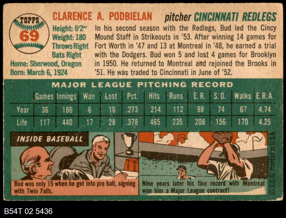 | 1954 Topps #69 Bud Podbielan | 3 - VG | Front | Back |
