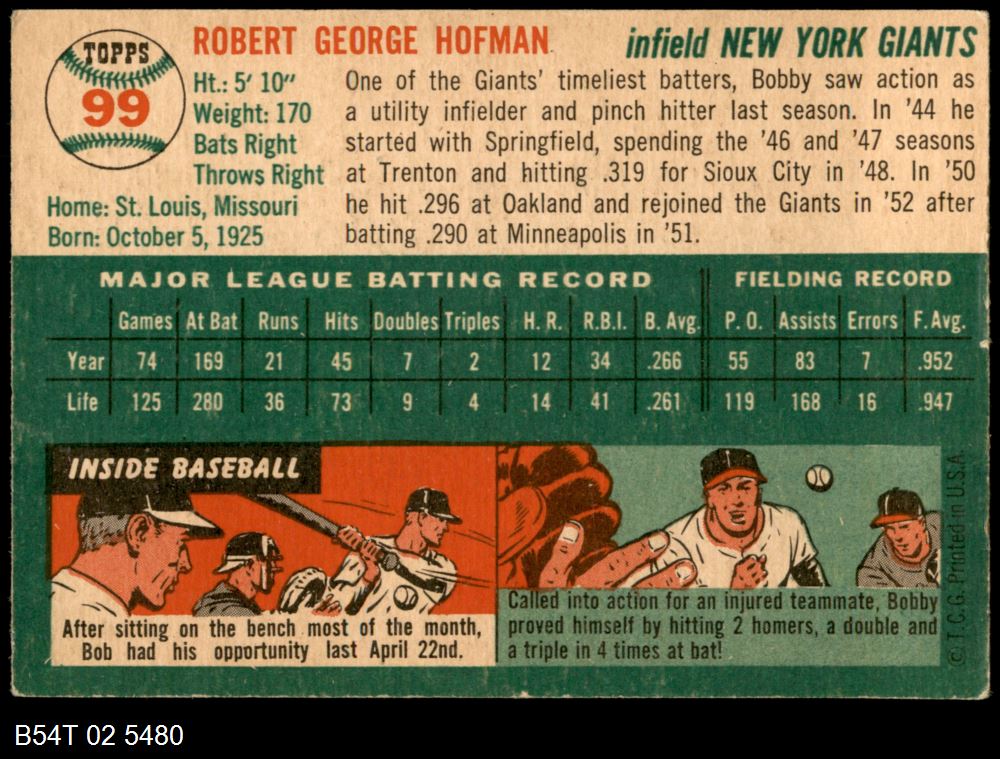 | 1954 Topps #99 Bobby Hofman | 5 - EX | Front | Back |