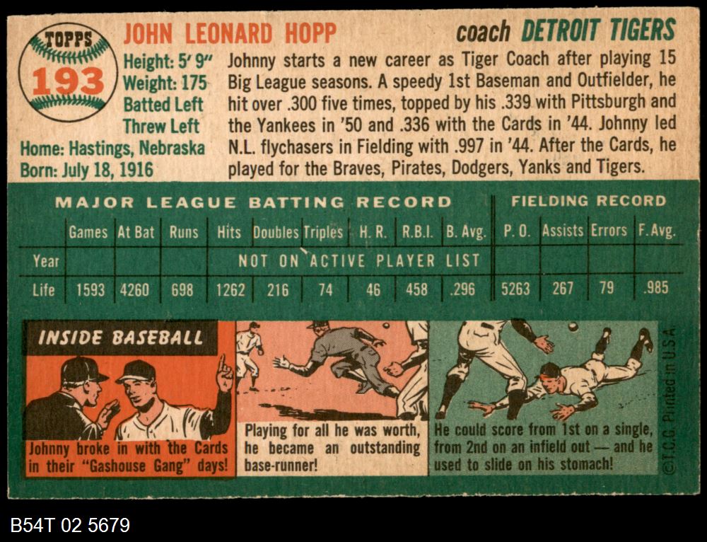 | 1954 Topps #193 Johnny Hopp | 6 - EX/MT | Front | Back |