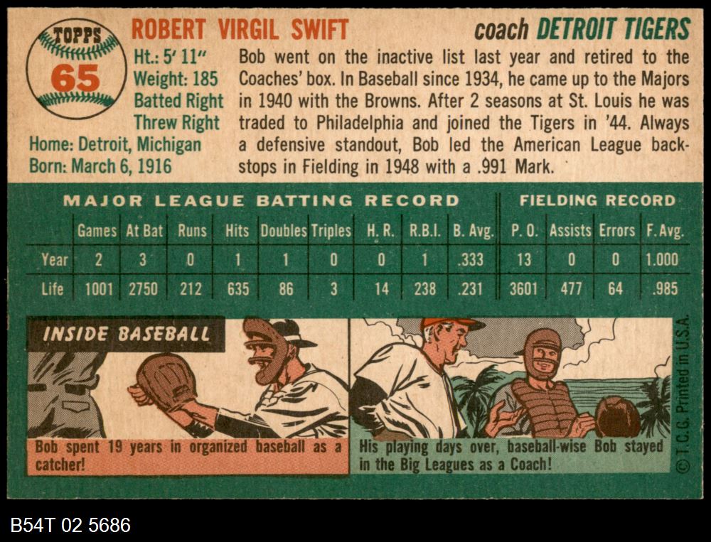 | 1954 Topps #65 Bob Swift | 5 - EX | Front | Back |