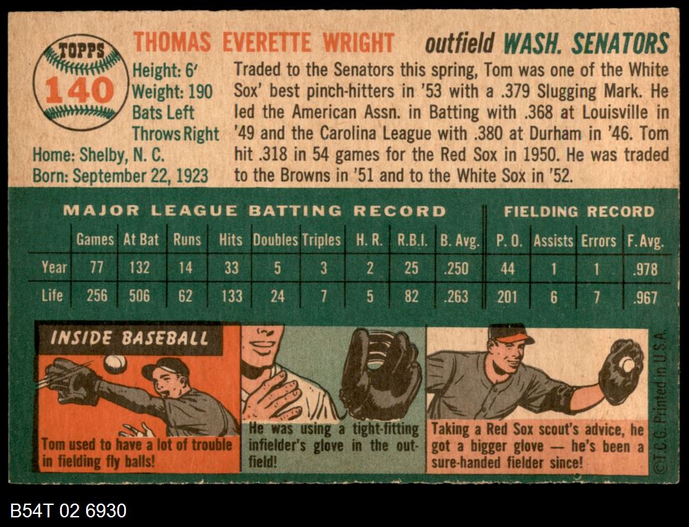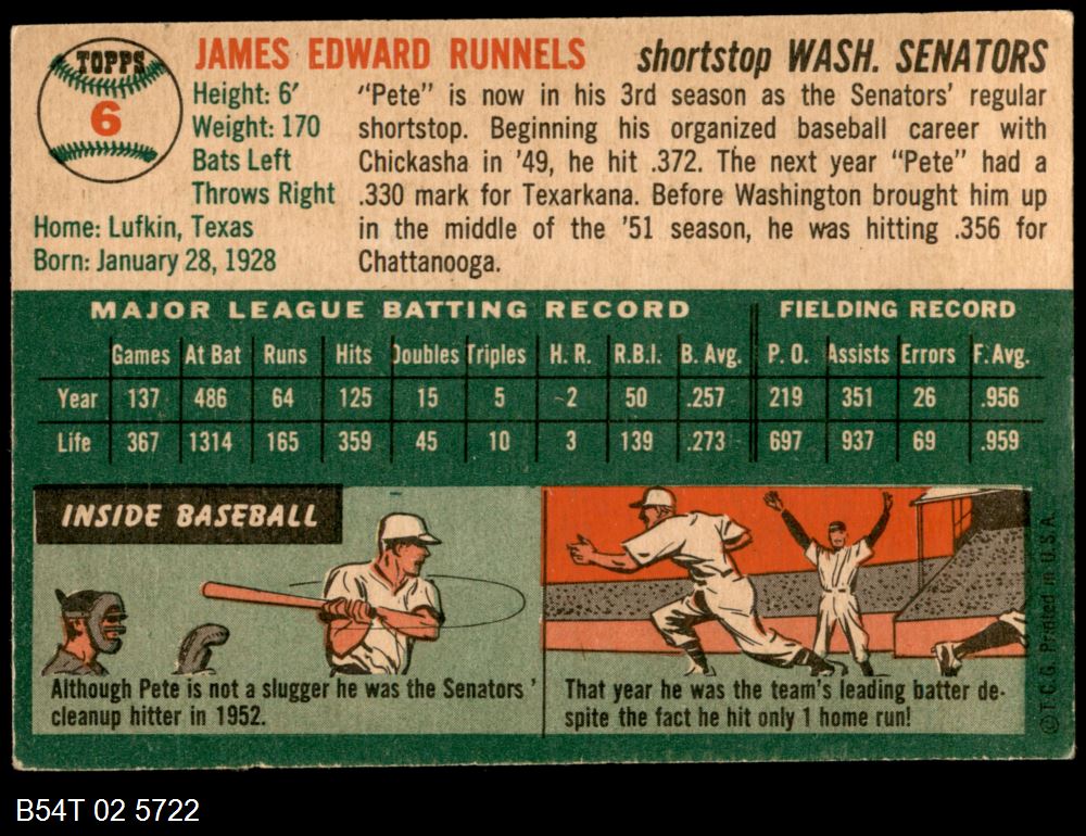 | 1954 Topps #6 WHT Pete Runnels | 5 - EX | Front | Back |