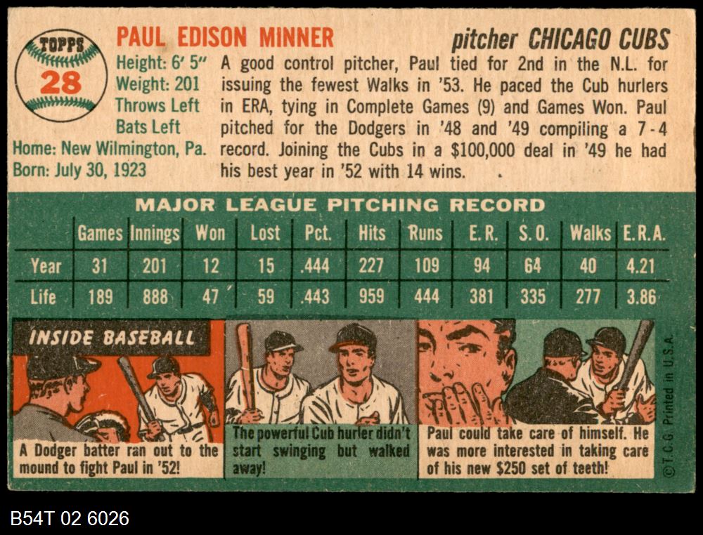 | 1954 Topps #28 WHT Paul Minner | 5 - EX | Front | Back |