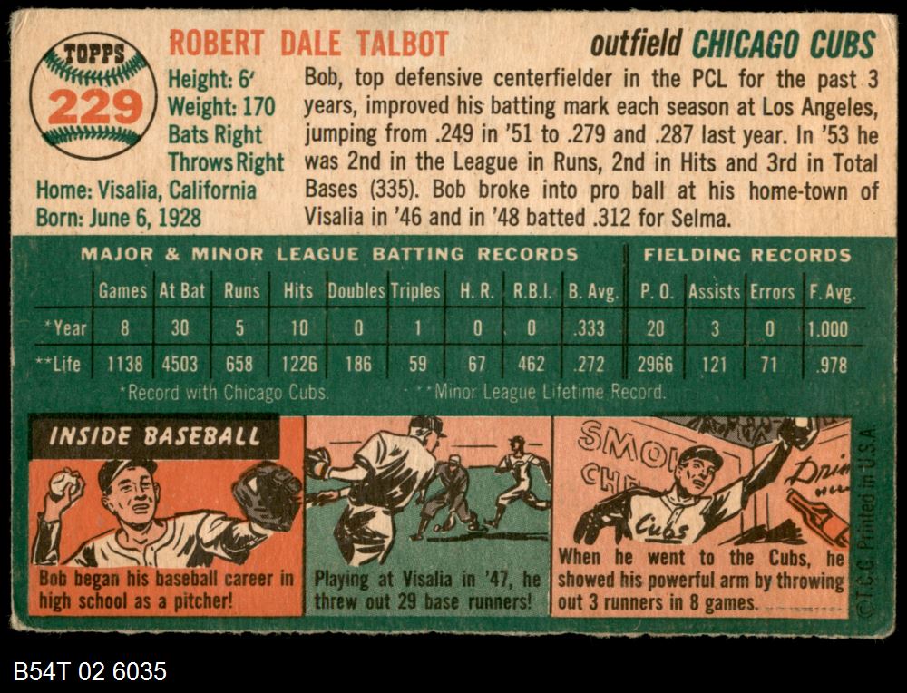 | 1954 Topps #229 Bob Talbot | 3.5 - VG+ | Front | Back |