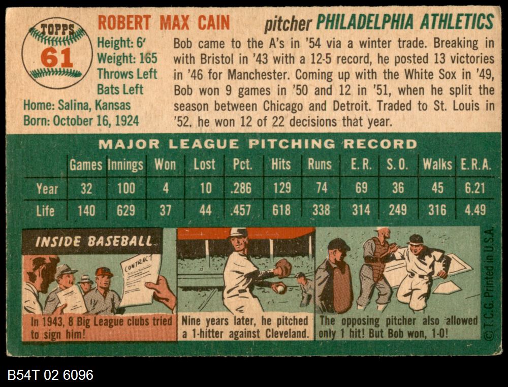 | 1954 Topps #61 Bob Cain | 3 - VG | Front | Back |