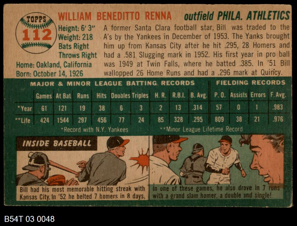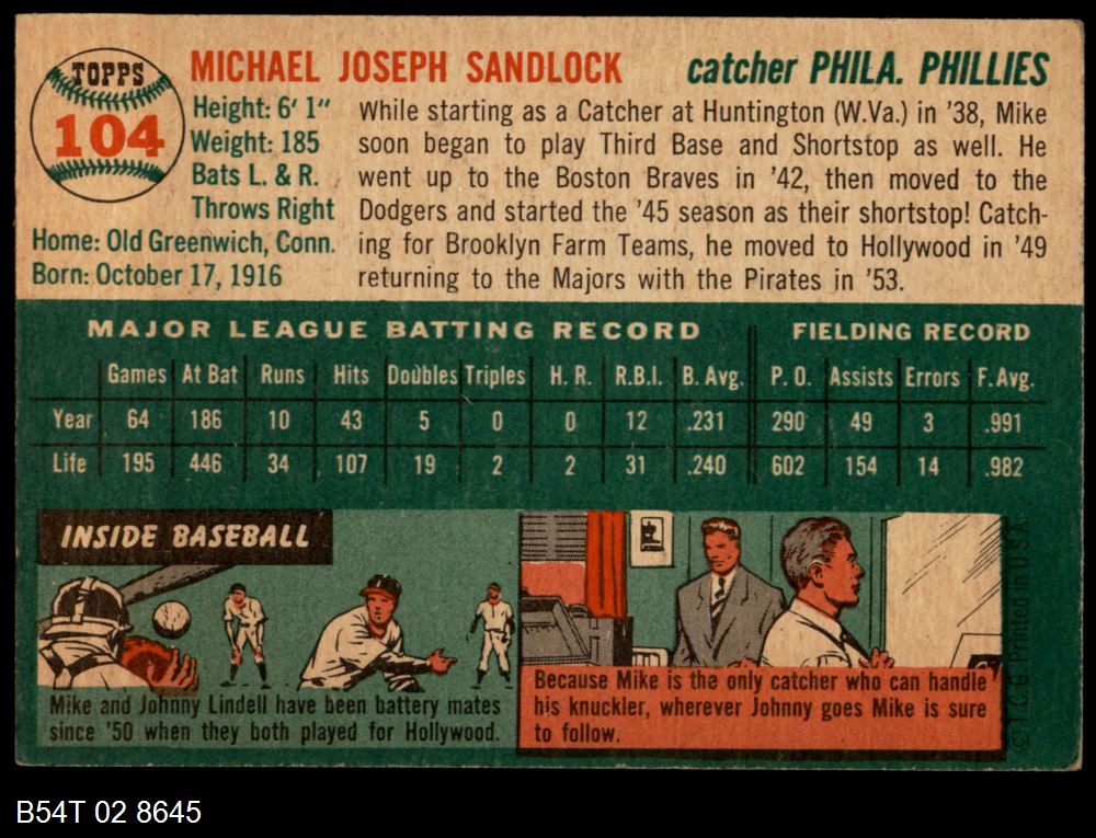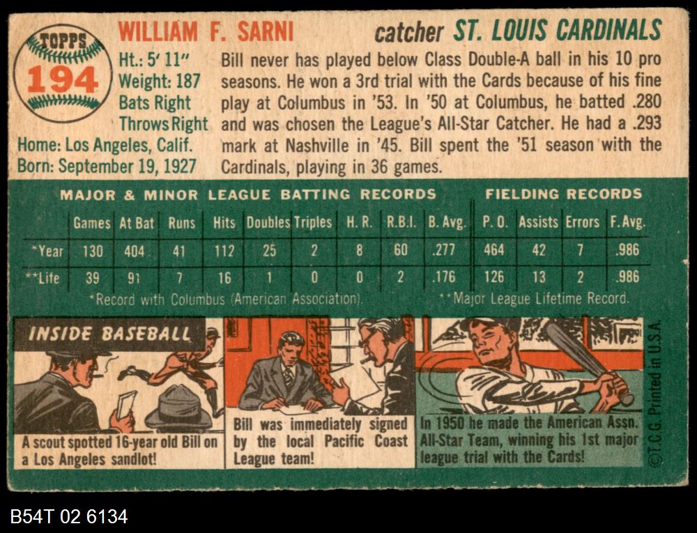 | 1954 Topps #194 Bill Sarni | 4 - VG/EX | Front | Back |