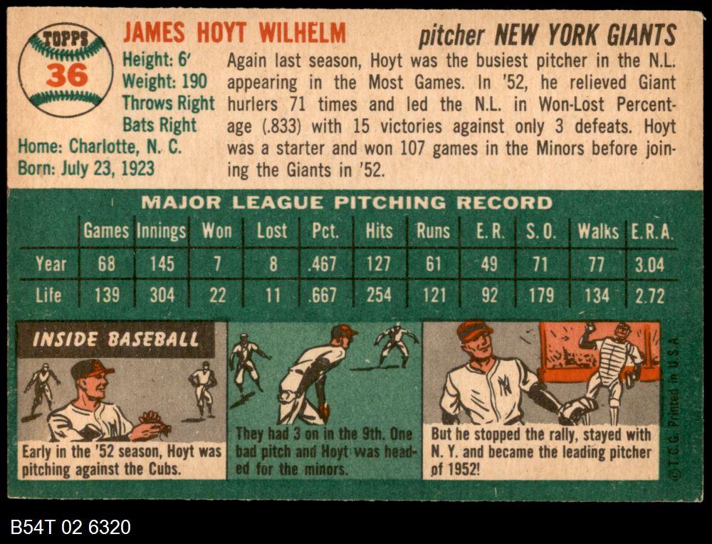 | 1954 Topps #36 WHT Hoyt Wilhelm | 5 - EX | Front | Back |