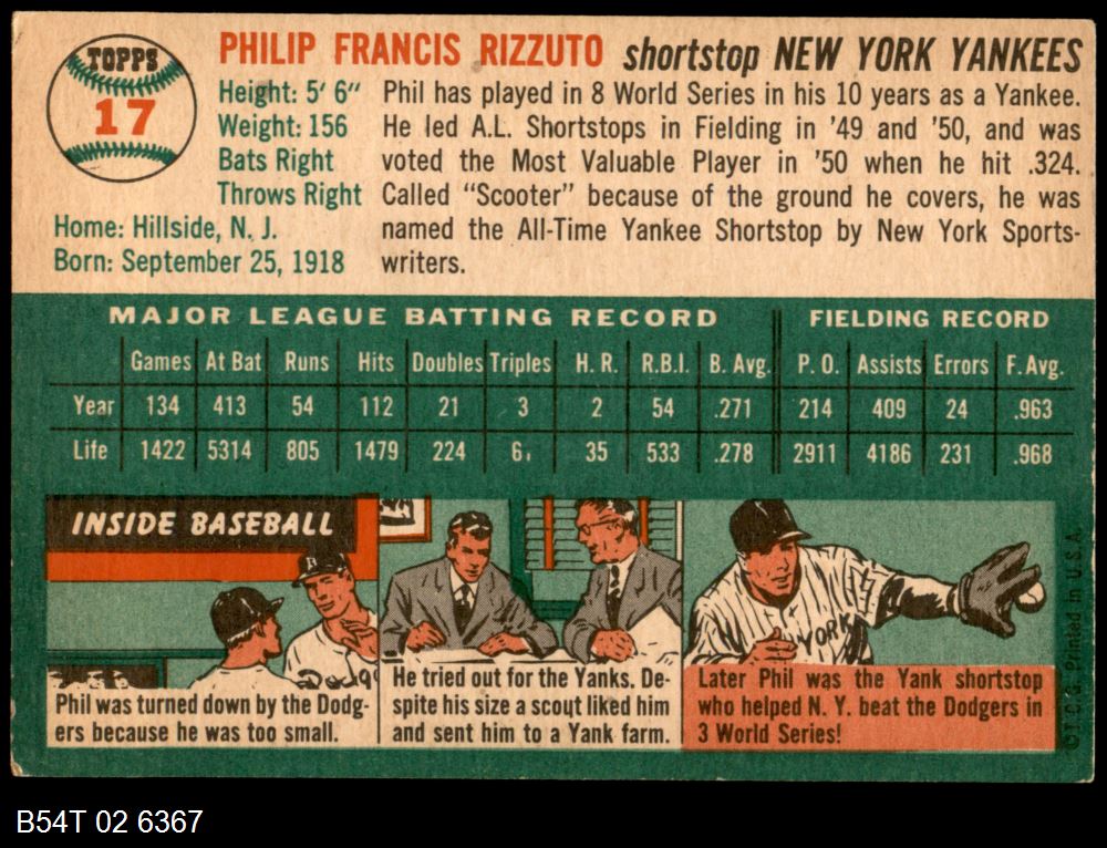 | 1954 Topps #17 WHT Phil Rizzuto | 5 - EX | Front | Back |