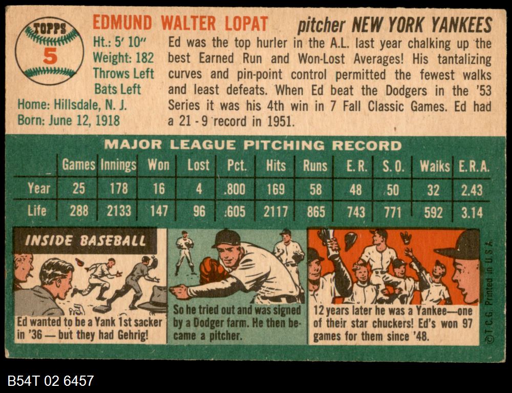 | 1954 Topps #5 WHT Eddie Lopat | 5 - EX | Front | Back |