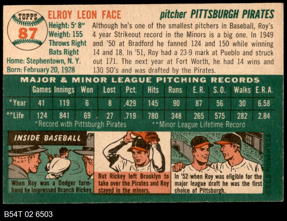 | 1954 Topps #87 Roy Face | 6 - EX/MT | Front | Back |