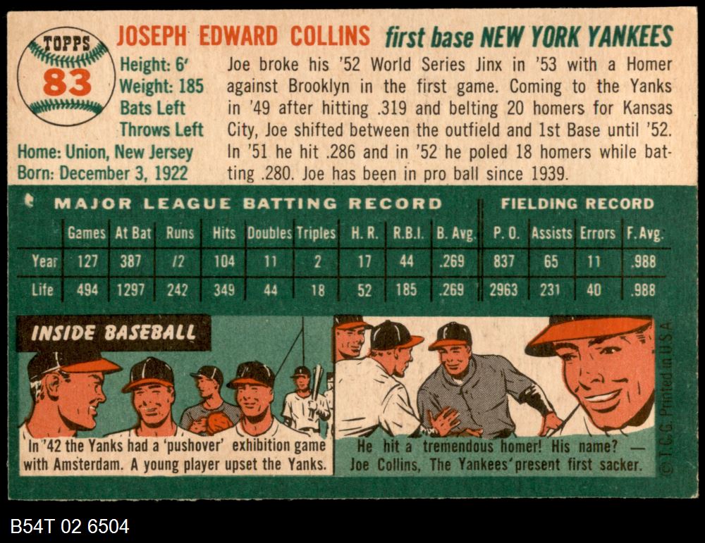 | 1954 Topps #83 Joe Collins | 5 - EX | Front | Back |