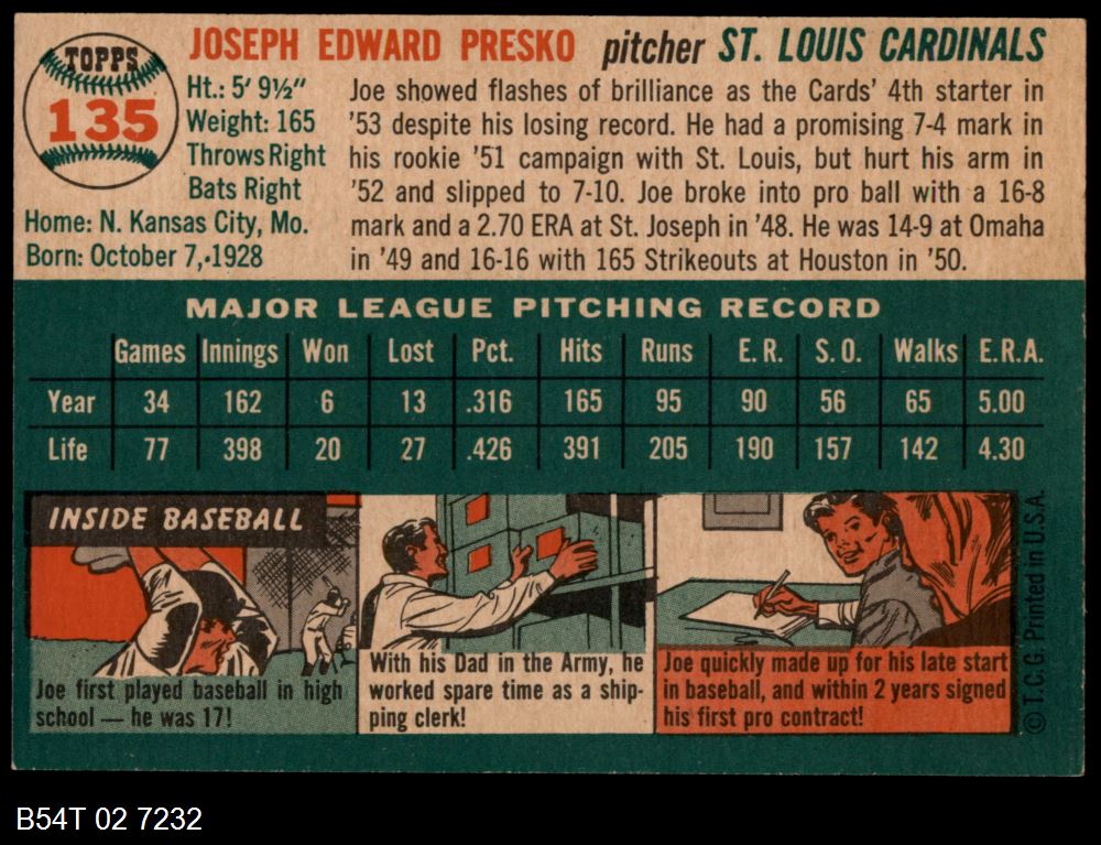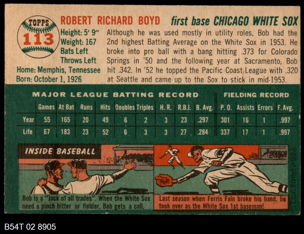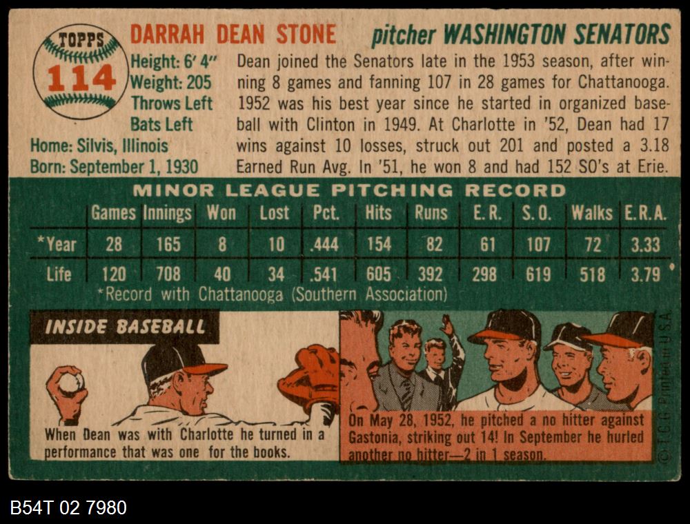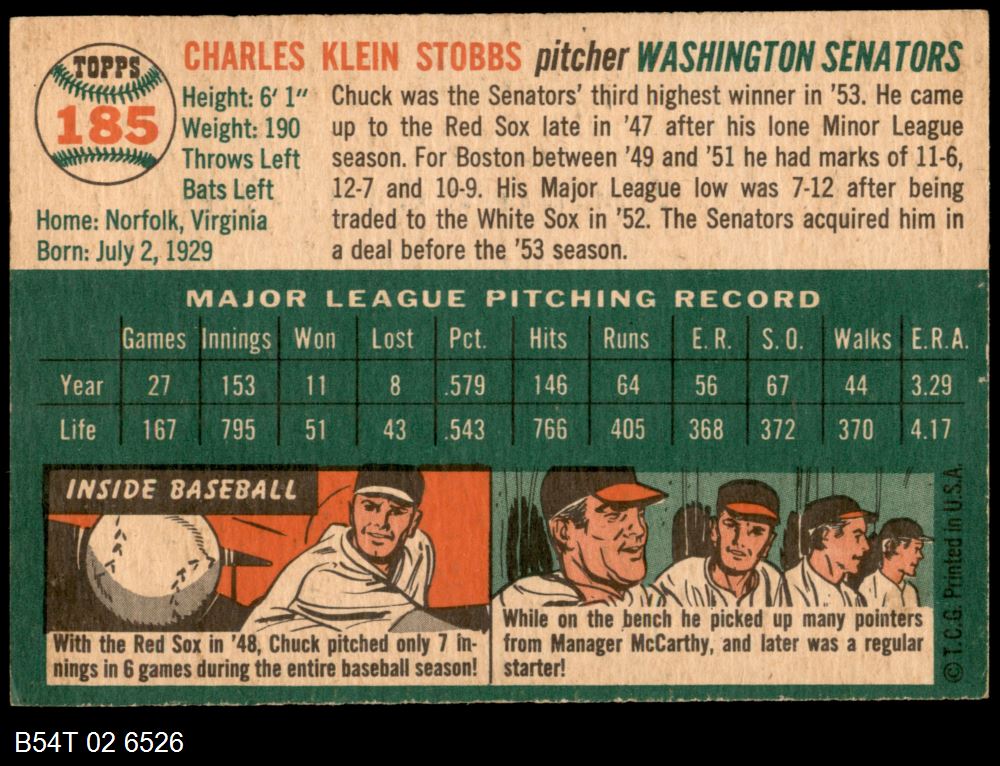 | 1954 Topps #185 Chuck Stobbs | 5 - EX | Front | Back |