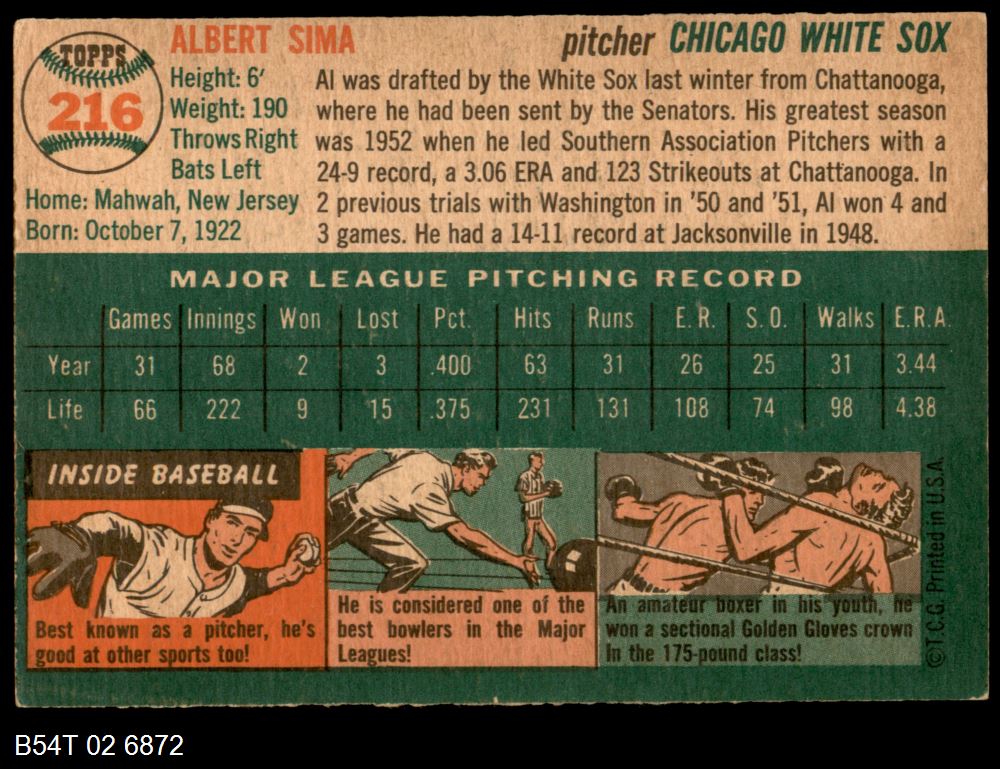 | 1954 Topps #216 Al Sima | 5 - EX | Front | Back |