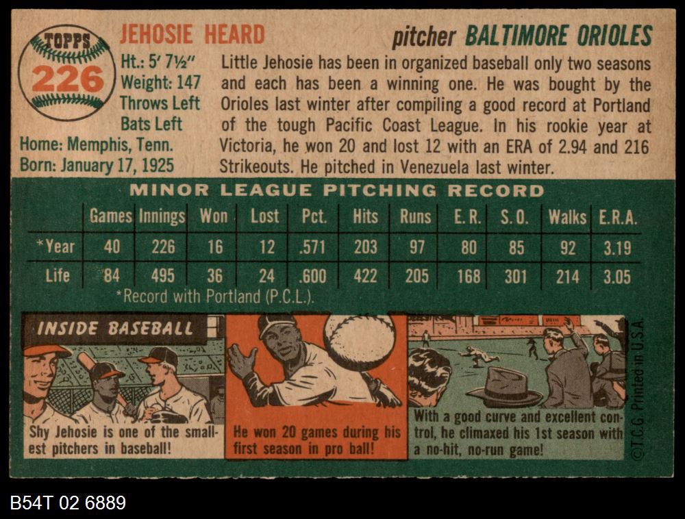 | 1954 Topps #226 Jehosie Heard | 6 - EX/MT | Front | Back |