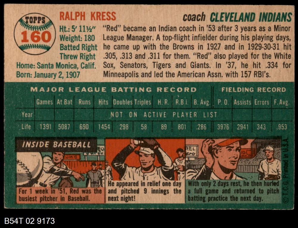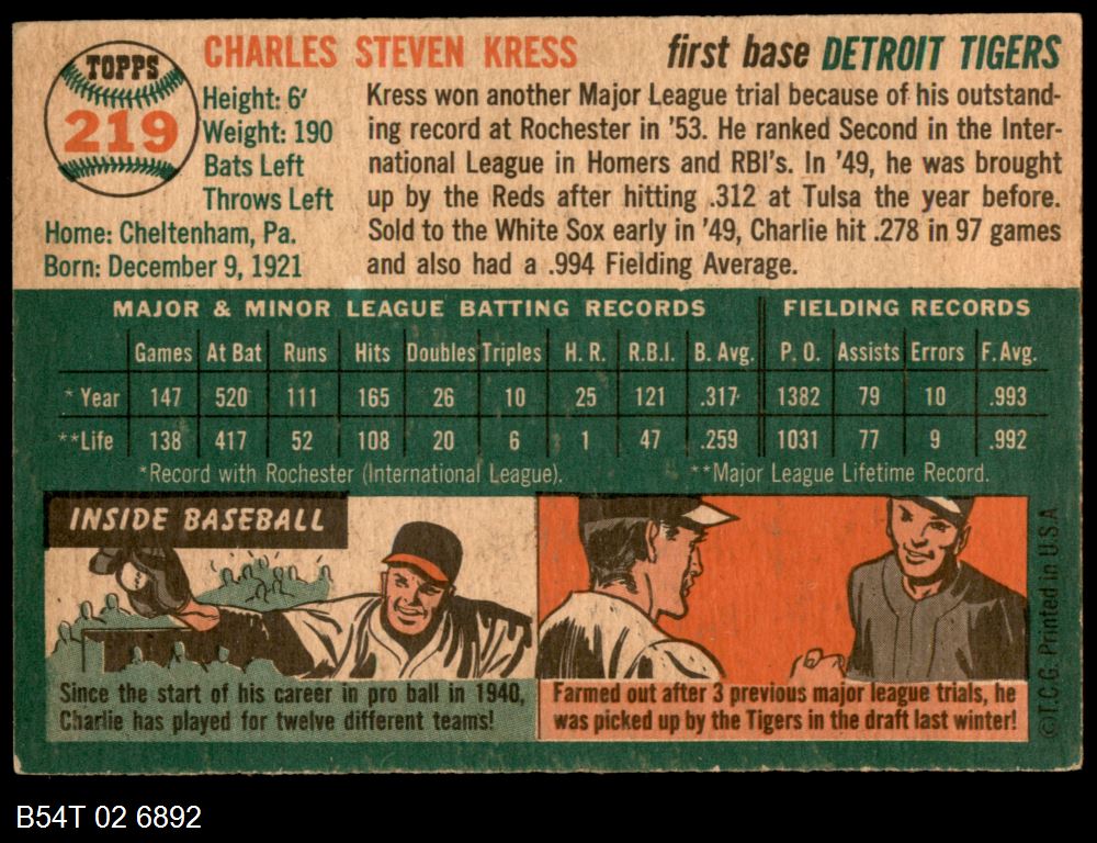 | 1954 Topps #219 Charlie Kress | 4 - VG/EX | Front | Back |