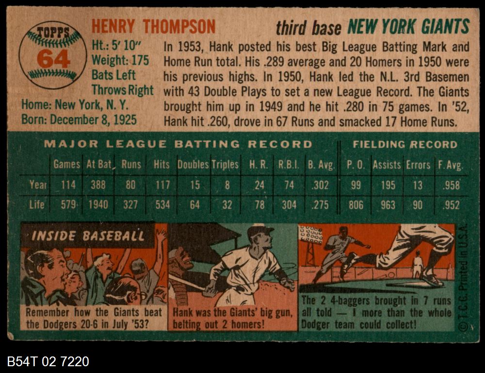 | 1954 Topps #64 Hank Thompson | 4 - VG/EX | Front | Back |