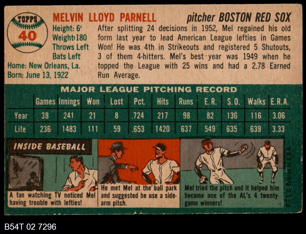 | 1954 Topps #40 WHT Mel Parnell | 5 - EX | Front | Back |