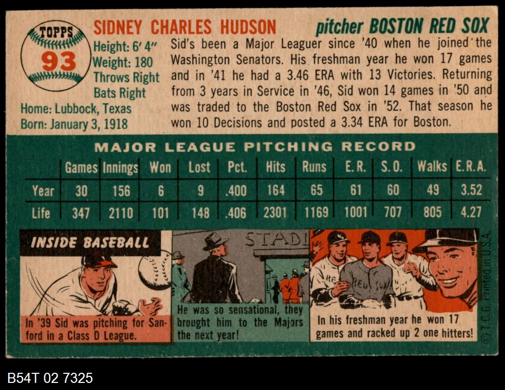 | 1954 Topps #93 Sid Hudson | 5 - EX | Front | Back |