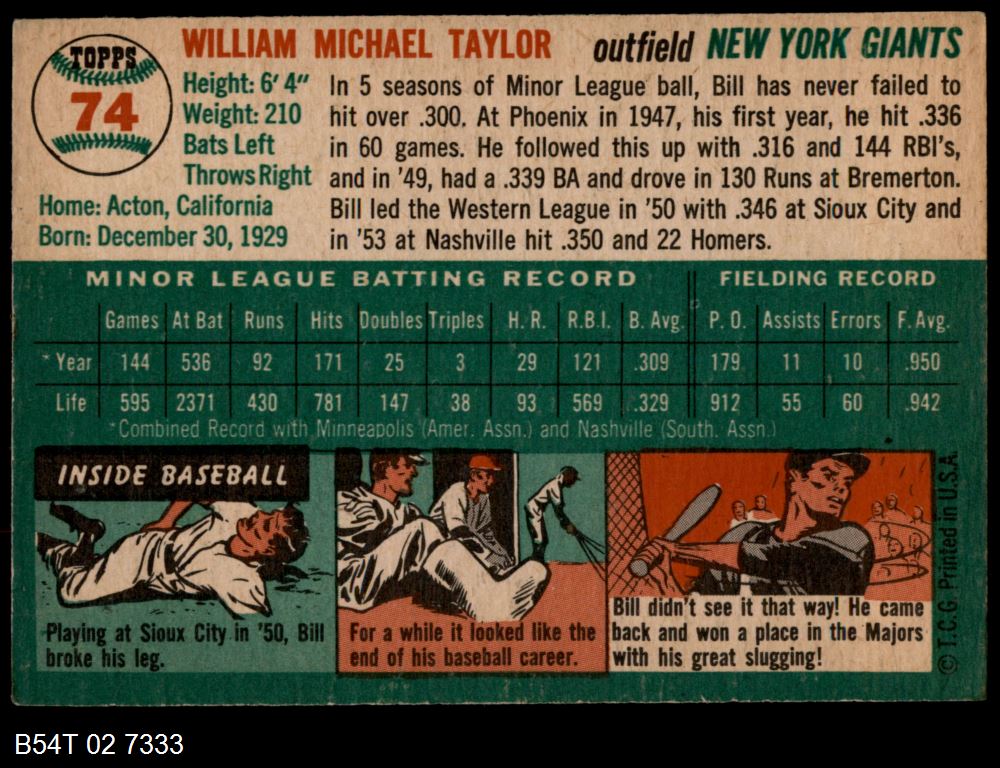| 1954 Topps #74 Bill Taylor | 4 - VG/EX | Front | Back |