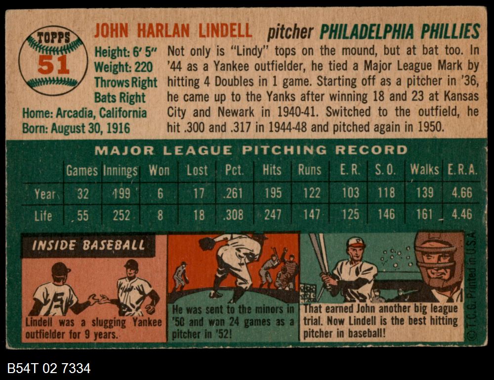 | 1954 Topps #51 Johnny Lindell | 4 - VG/EX | Front | Back |