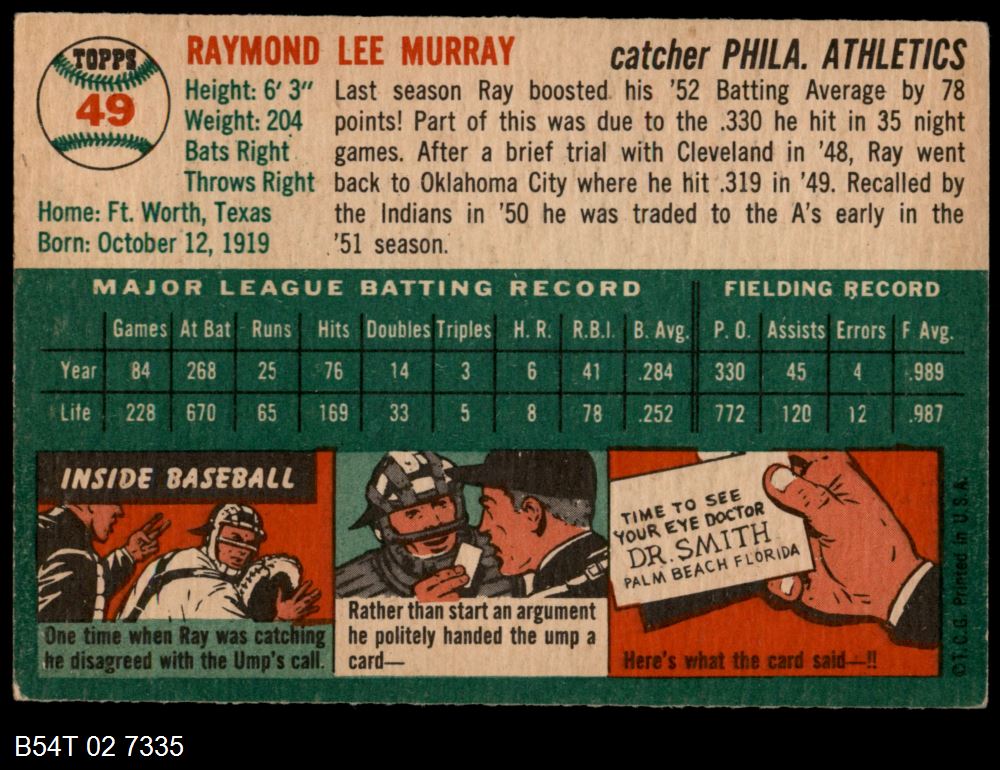 | 1954 Topps #49 WHT Ray Murray | 4 - VG/EX | Front | Back |