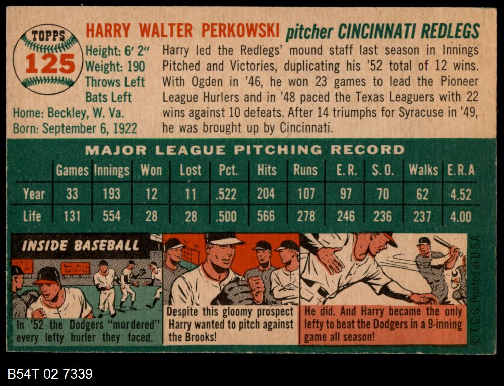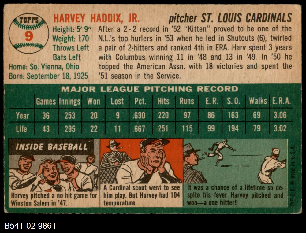 | 1954 Topps #9 WHT Harvey Haddix | 3 - VG | Front | Back |