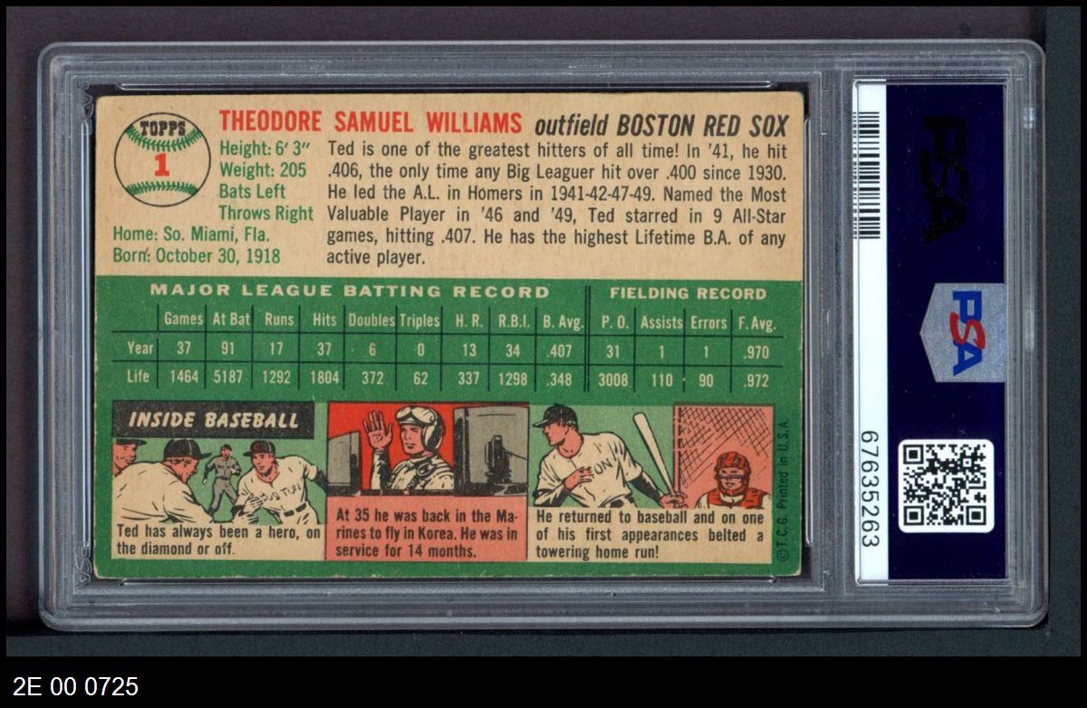 | 1954 Topps #1 WHT Ted Williams | PSA 3 - VG | Front | Back |