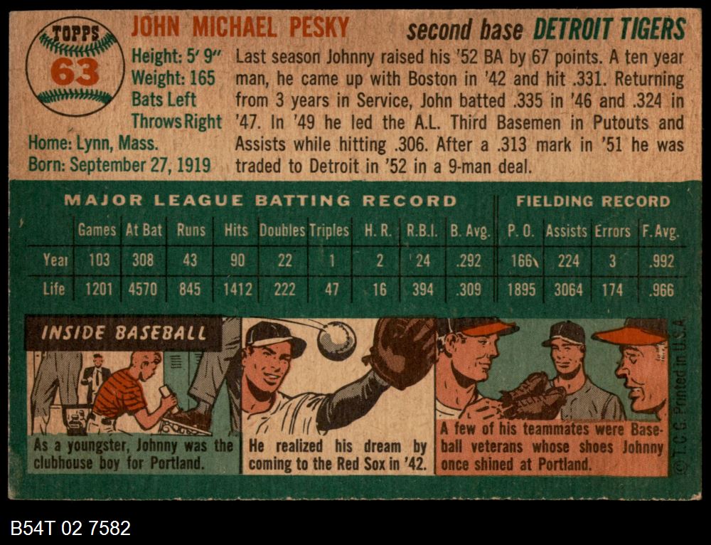 | 1954 Topps #63 Johnny Pesky | 5 - EX | Front | Back |