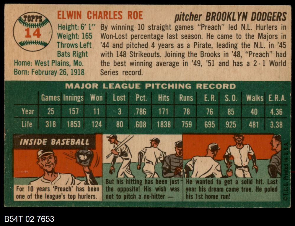 | 1954 Topps #14 WHT Preacher Roe | 4 - VG/EX | Front | Back |