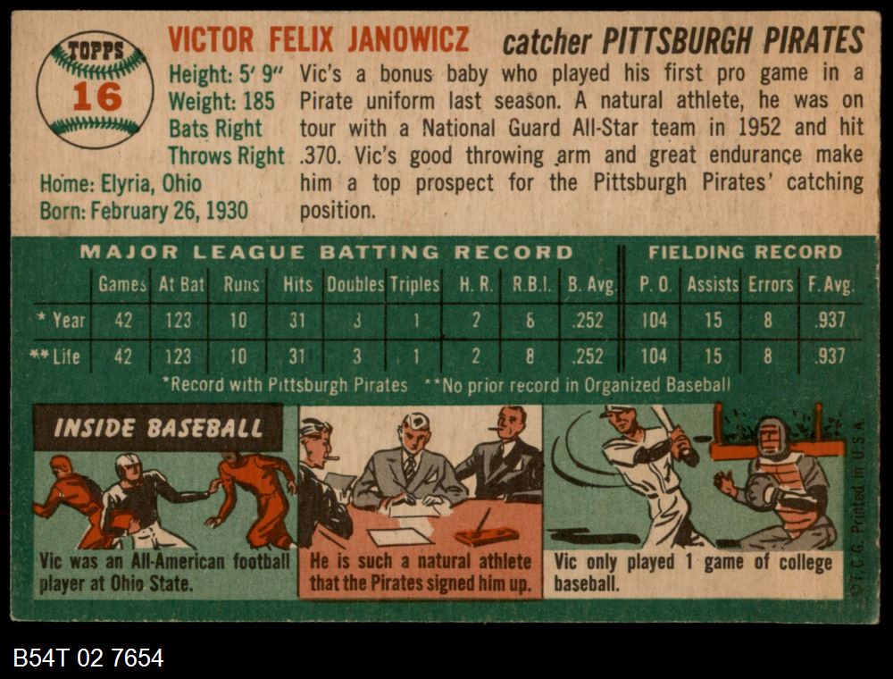 | 1954 Topps #16 WHT Vic Janowicz | 4 - VG/EX | Front | Back |