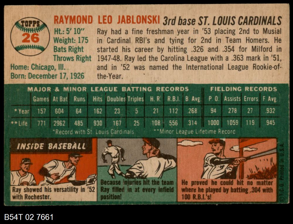 | 1954 Topps #26 WHT Ray Jablonski | 4 - VG/EX | Front | Back |