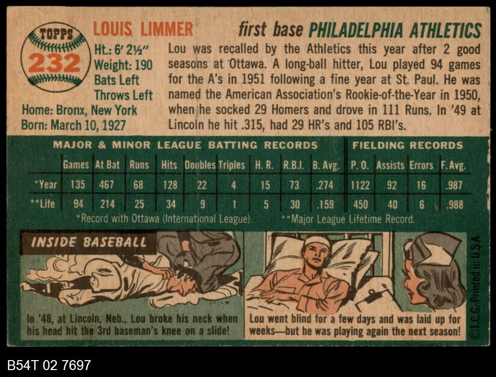 | 1954 Topps #232 Lou Limmer | 4 - VG/EX | Front | Back |