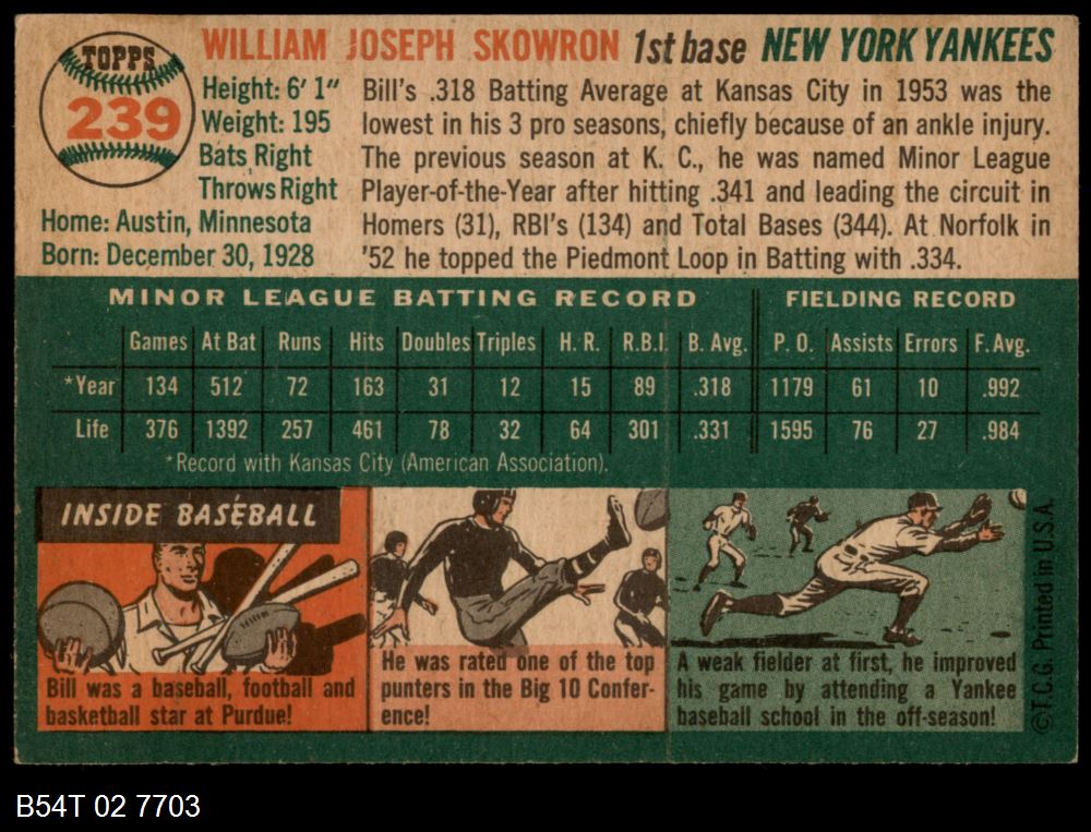 | 1954 Topps #239 Bill Skowron | 4 - VG/EX | Front | Back |